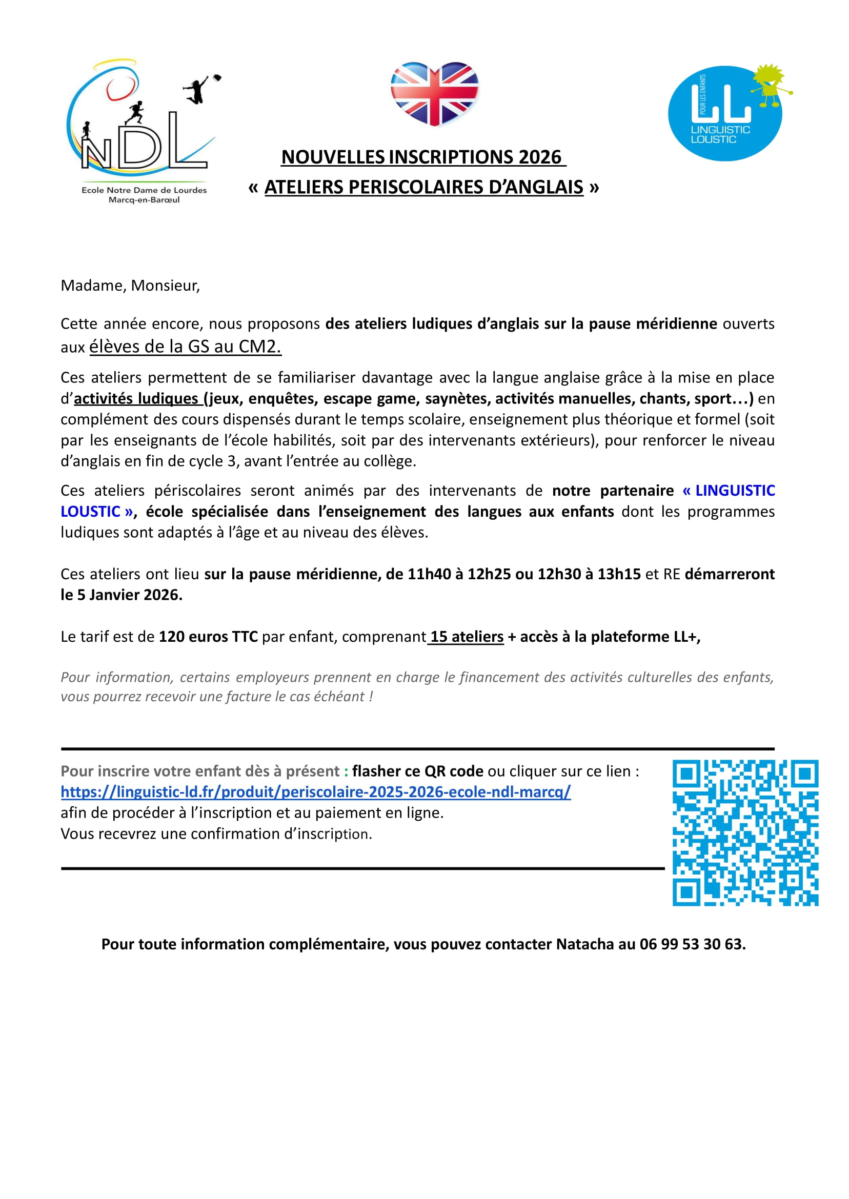 Ateliers périscolaires « École Notre Dame de Lourdes Marcq » Année 2025-2026 *